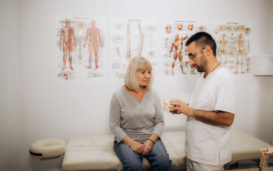 Spine problems are evident in the model. A woman is in consultation with the doctor in the clinic.